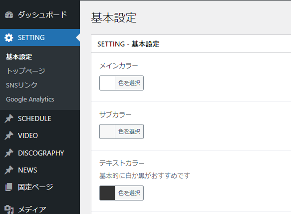 WordPressアドレスとサイトアドレスが一致していない場合、デフォルトではLIVE、VIDEO、DISCOGRAPHページのリンクURLが間違っている可能性があります。