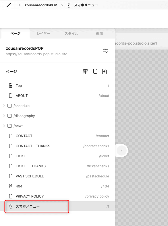スマホ用のメニューは「ページ」タブにて「スマホメニュー」を選択。