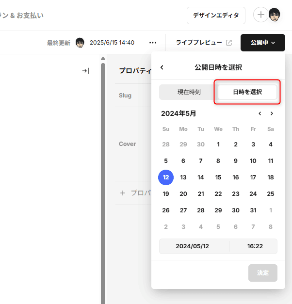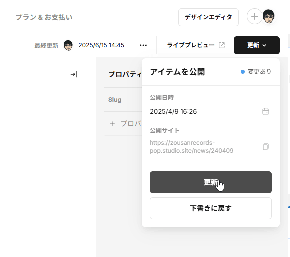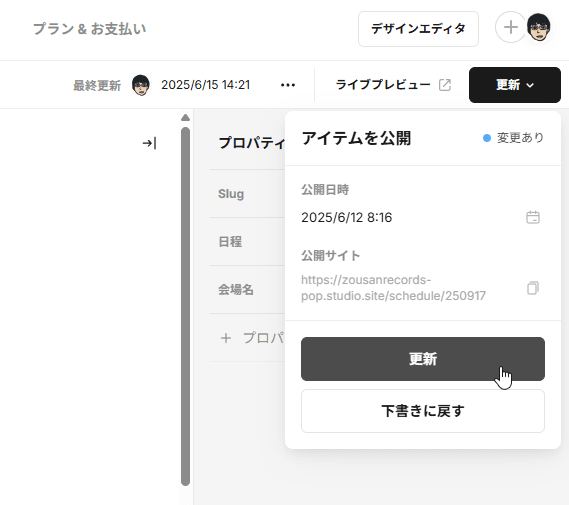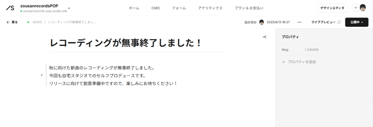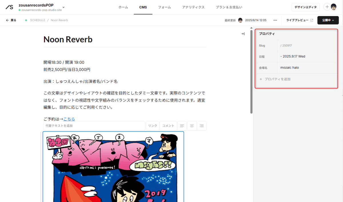 左側のエディタでライブの詳細を、右側の「プロパティ」にて各項目を入力します。