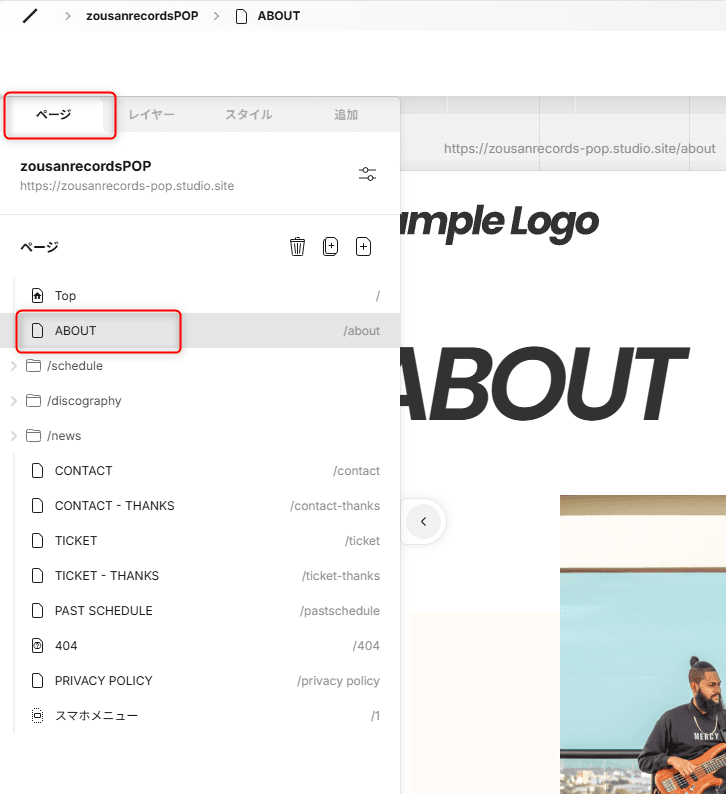 左側のメニューを開いて「ページ」タブで「ABOUT」を選択。