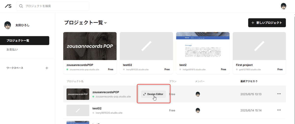 プロジェクト一覧の「Design Editor」から編集画面に入れます。
