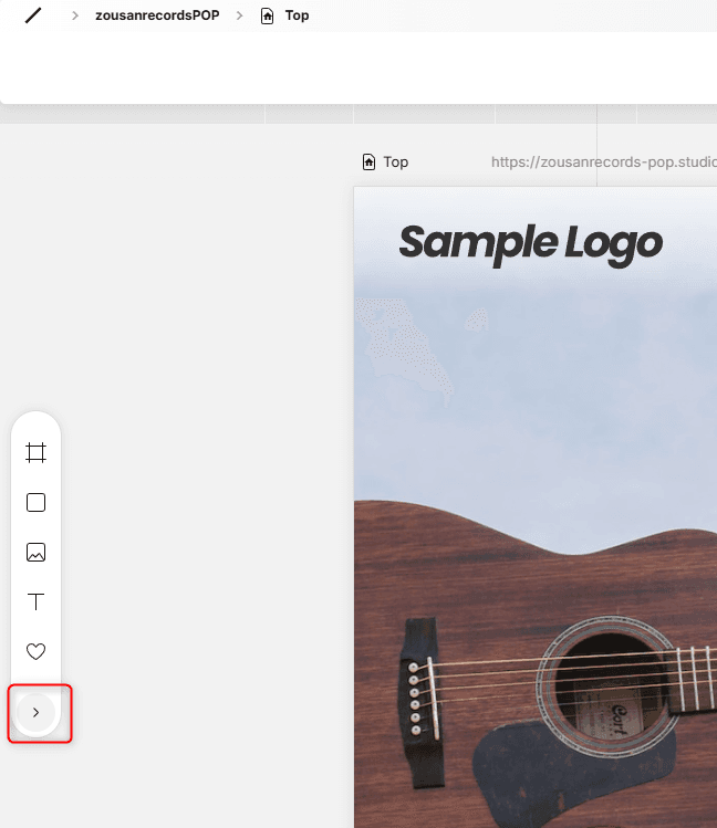 デザインエディタの左側メニューの矢印からメニューを開きます。