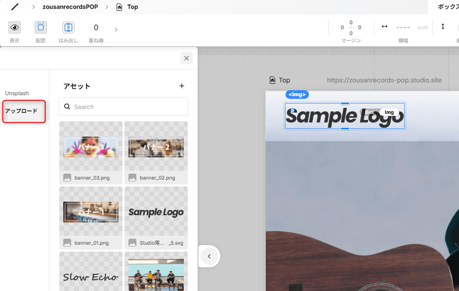 メニューの「アップロード」からご自身のロゴをアップロードします。