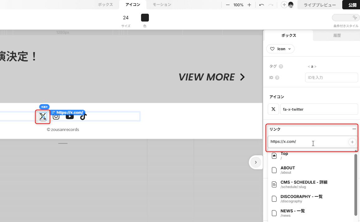 各SNSのアイコンをダブルクリック→右のメニュー「リンク」にてURLを入力