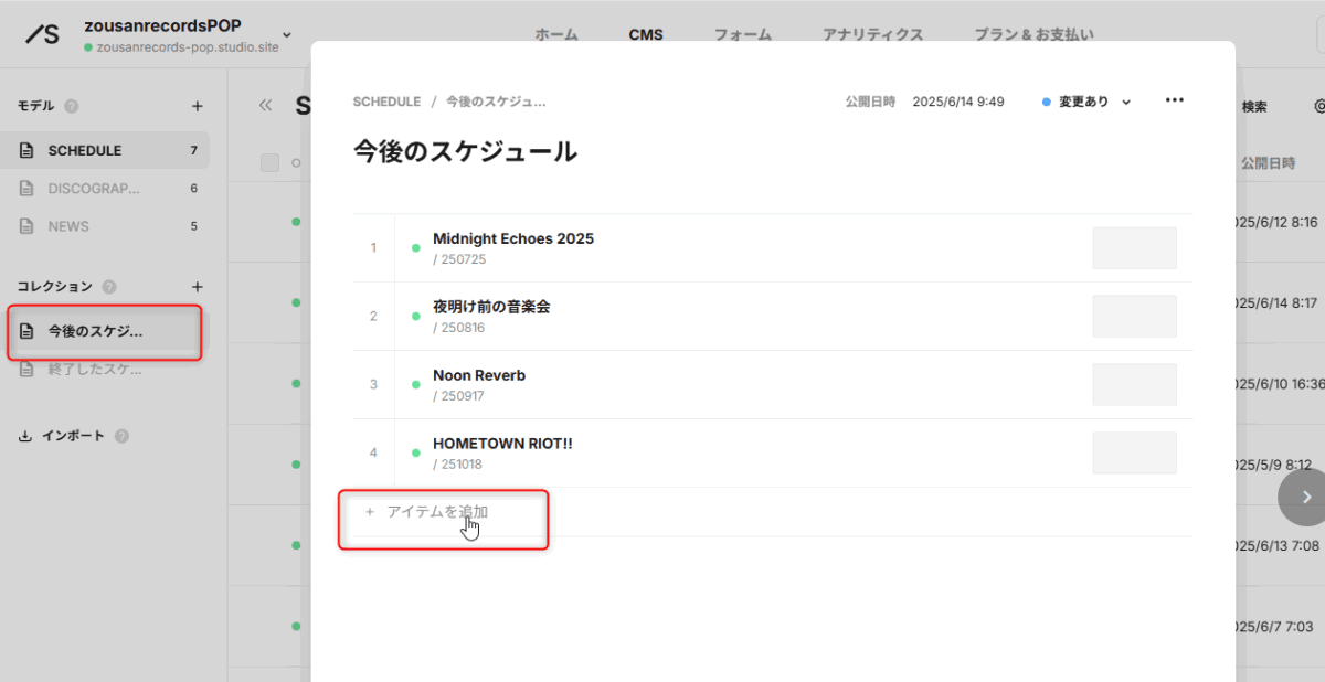左側のメニュー「コレクション」→「今後のスケジュール」にて登録したライブ情報を追加します。