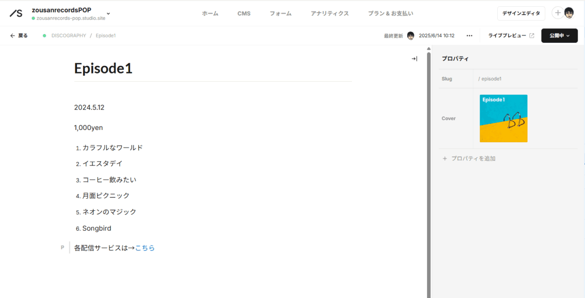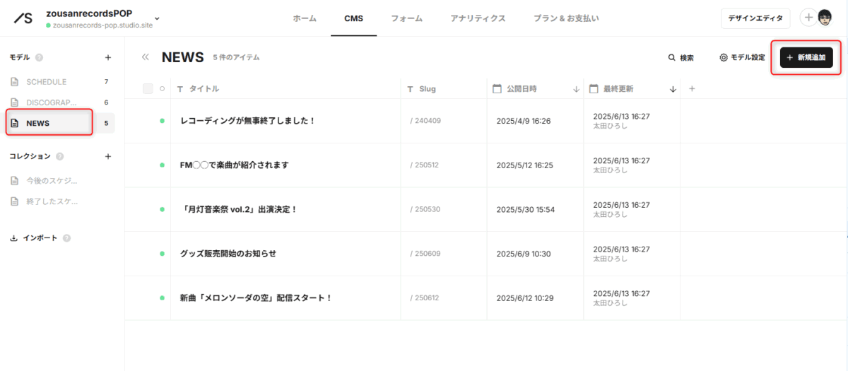 「CMS」から「DISCOGRAPHY」を選択→「新規追加」