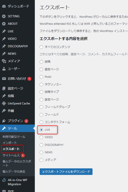より「LIVE」にチェックを入れて「エクスポートファイルをダウンロード」