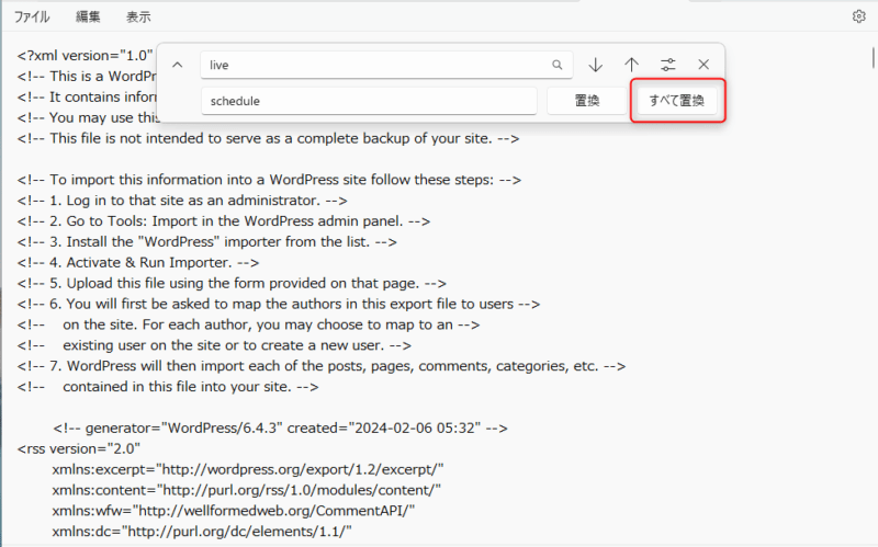 にて「live」という文字をすべて「schedule」に置換します。(置換方法は各エディタのマニュアルをご参照ください)