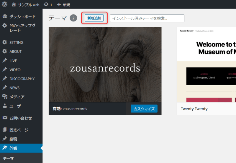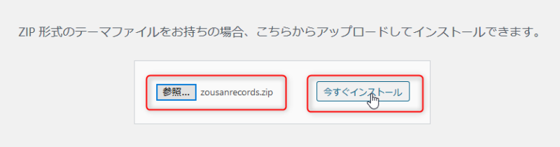 参照から、テーマのzipファイルを選択。(zipファイルは解凍せずにそのまま)を選択