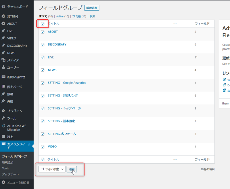 次にプラグイン「advanced custom fields」を更新します。管理画面メニュー