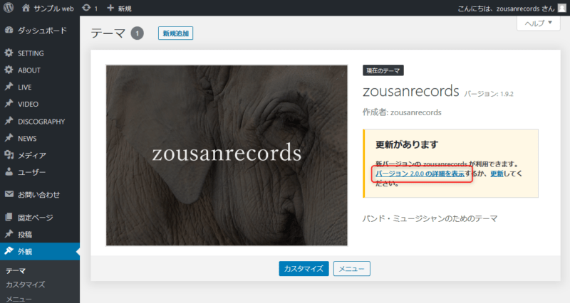 テーマがアップデートした場合、通知が来るので管理画面メニュー