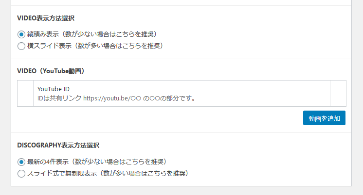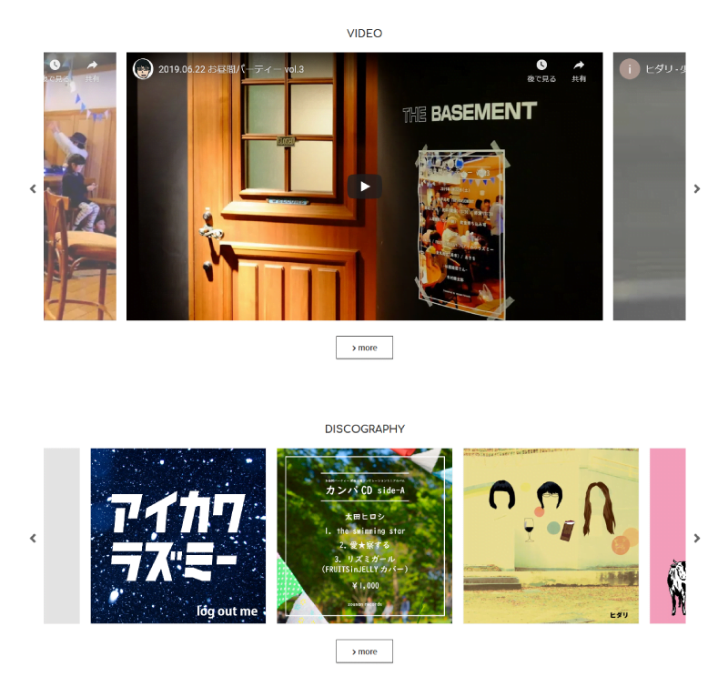 VIDEO、DISCOGRAPHYの要素が多い場合のために、スライド式で表示できるようにしました。