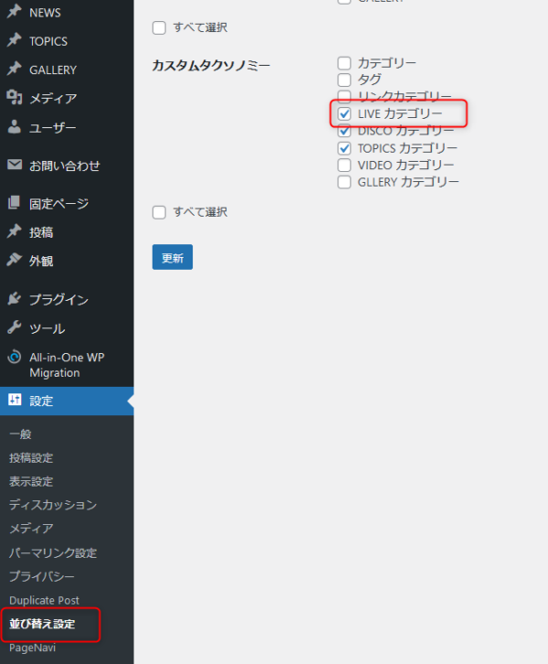 設定→並び替え設定→カスタムタクソノミー
