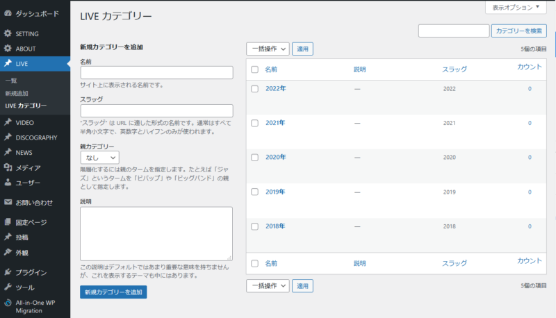 「LIVE」ページにて、年をカテゴリー登録することにより、年別のアーカイブを表示できるようになりました。