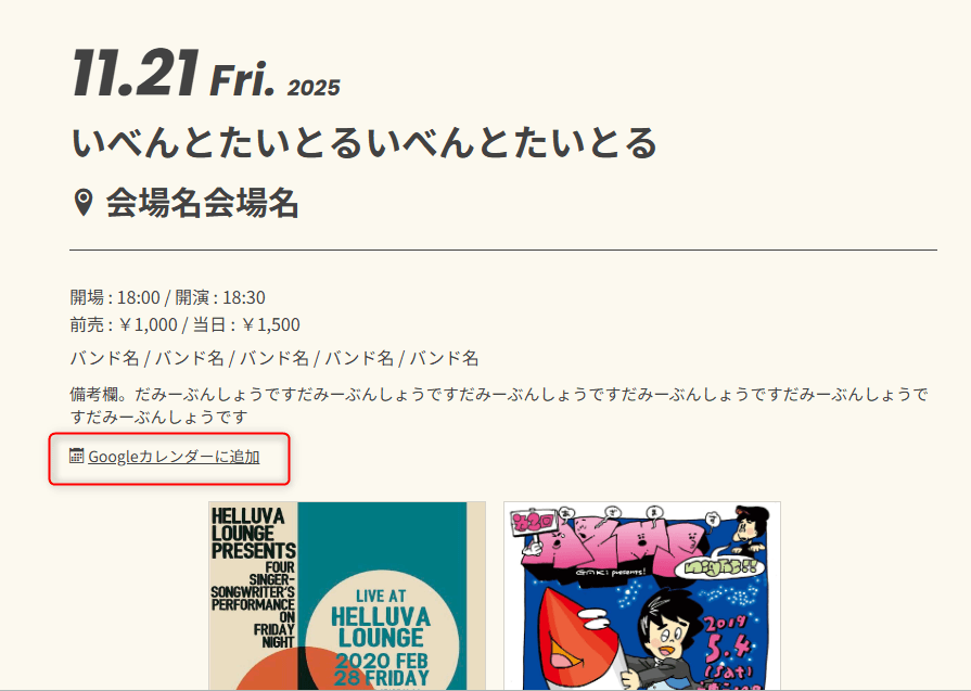 LIVE/SCHEDULEページの詳細に「Googleカレンダーに追加」リンクを表示できる機能です。